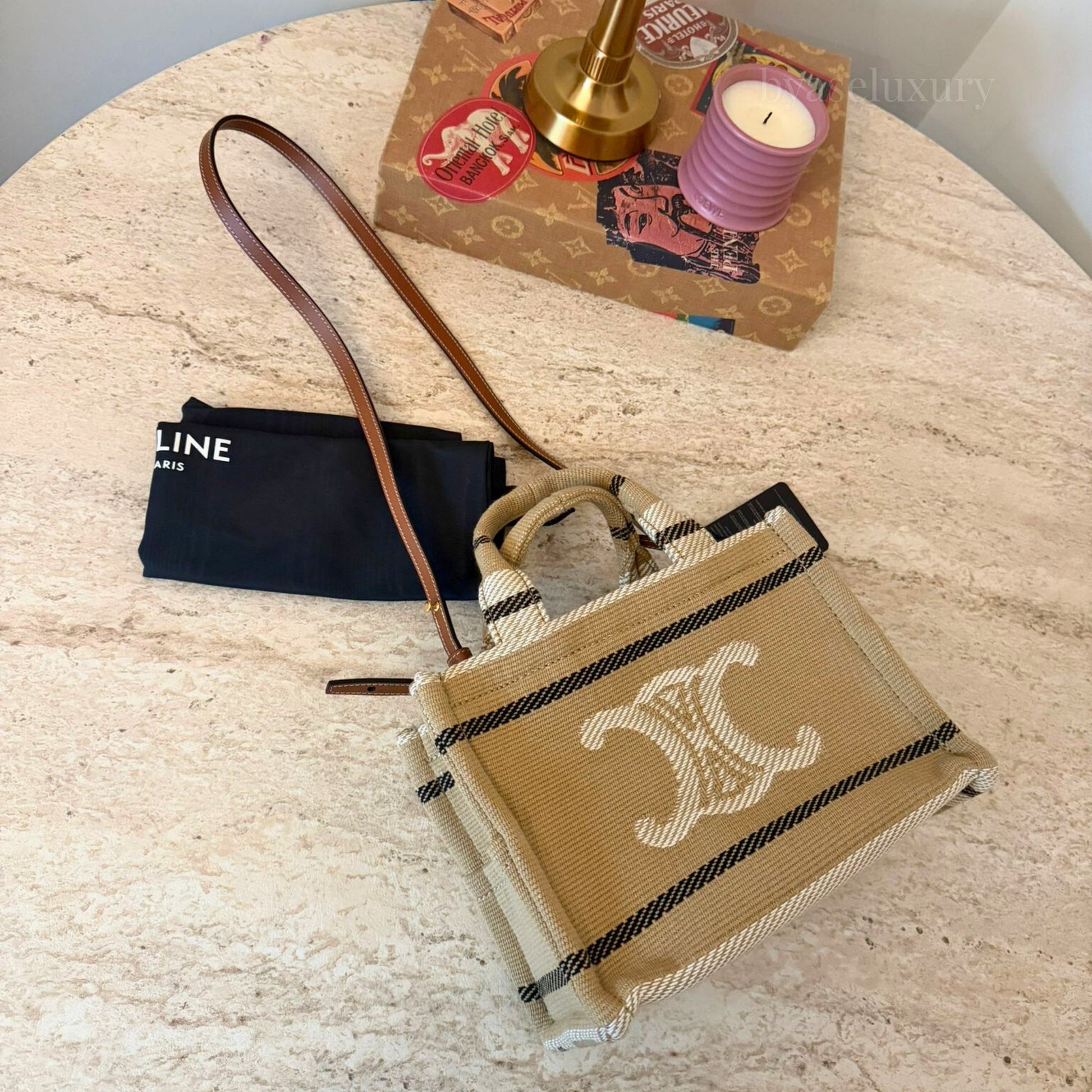 Celine’in modern ve sade tasarım anlayışını yansıtan Cabas kanvas mini çanta, markanın ikonik Triomphe logosunu zarif bir şekilde ön yüzünde taşıyor. Doğal tonlardaki kanvas dokusu ve minimal çizgileri sayesinde hem günlük kombinlere hem de şehir stiline kolayca uyum sağlar.