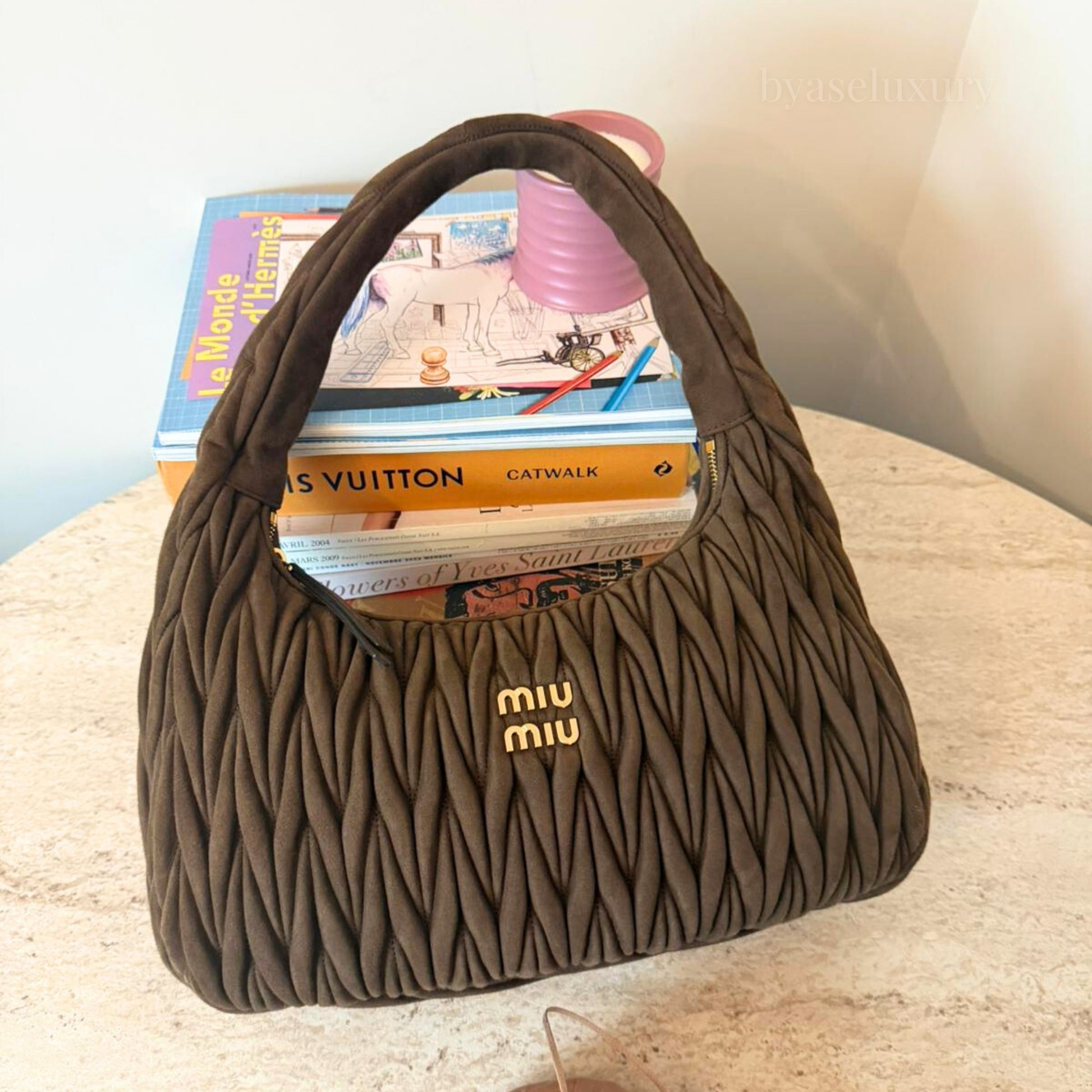 Kıvrımlı omuz askısı ve kompakt yapısı sayesinde şehir yaşamına uyum sağlayan bu model; gündüzden geceye uzanan stil geçişlerinde zahmetsiz bir şıklık yaratır. Altın tonlu Miu Miu logo detayı, tasarımı minimal ama net bir imza ile tamamlar.