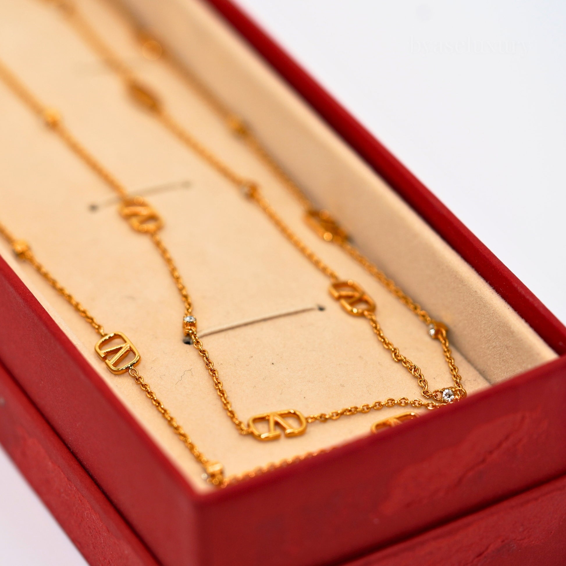 Valentino’nun ikonik VLogo motifleriyle tasarlanan bu taş detaylı gold kolye, zarafet ve ışıltıyı mükemmel bir dengede buluşturur.